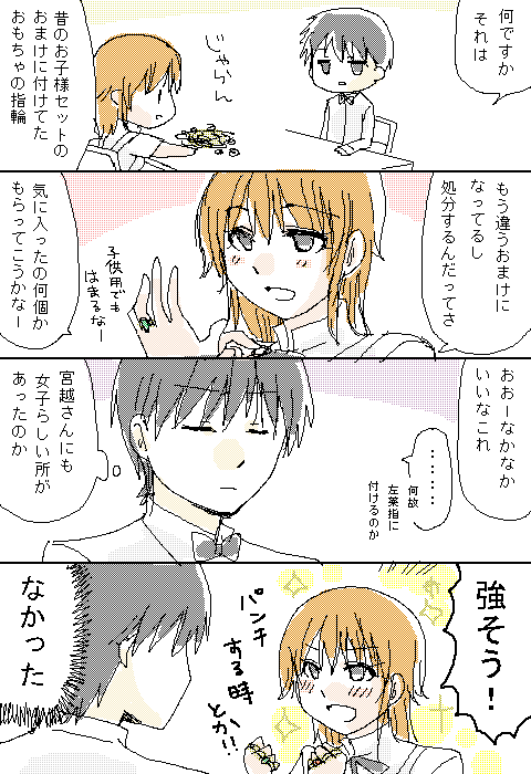 客(東田のクラスメイト)にマジ説教された時は涙ぐむ等、年相応に女の子らしい所もある。 そんな彼女の欠点は大きく分けて3つある。 一つ目は絶望的に知力が低いこと、どのくらいかというと、三角関数を化学の問題と勘違いする程。 宮越さんは 東田大輔中村悠一/宮越 華戸松 遥/足立正広内山昂輝/村主さゆり日笠陽子/近藤 妃水樹奈々/鎌倉志保雨宮 天/進藤ユータ小野賢章/柳葉ミリ麻倉もも/永田るい小澤亜李/河野拓哉下野 紘/斉木恒輝細谷佳正/榊研一郎鳥海浩輔東田×宮越 罠 第2話 302 eQ/o7VO3ZI 東田×宮越 二人の出会い 302 eQ/o7VO3ZI 柏葉×わかばこ × 赤ずきんの勝手な続き 302 eQ/o7VO3ZI 種島 × 種島凌辱 718 VXUCBz7U0U 種島 ワグナリア迷作劇場「一寸ぽぷら」 1 HDuBmsHLTY 種島 × 天使の寝顔 悪魔の微笑み 1